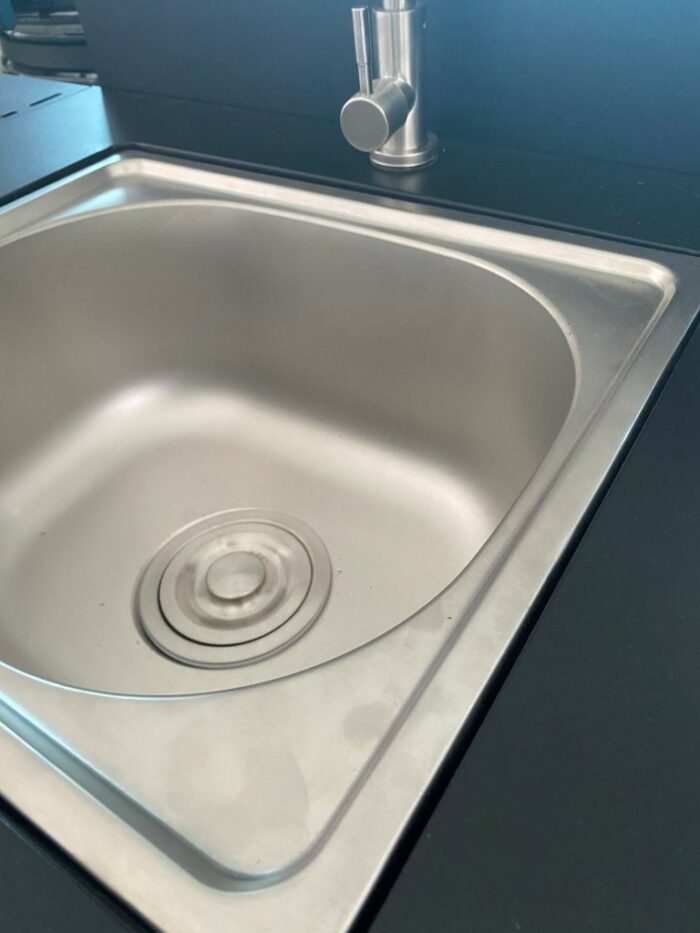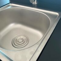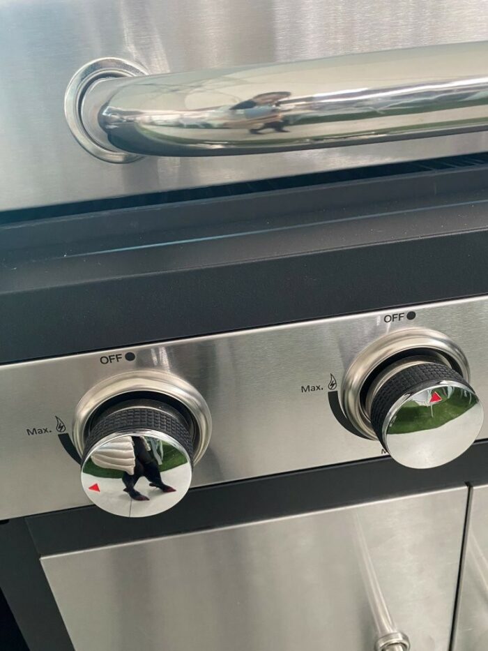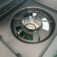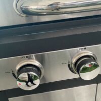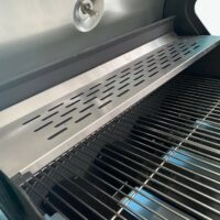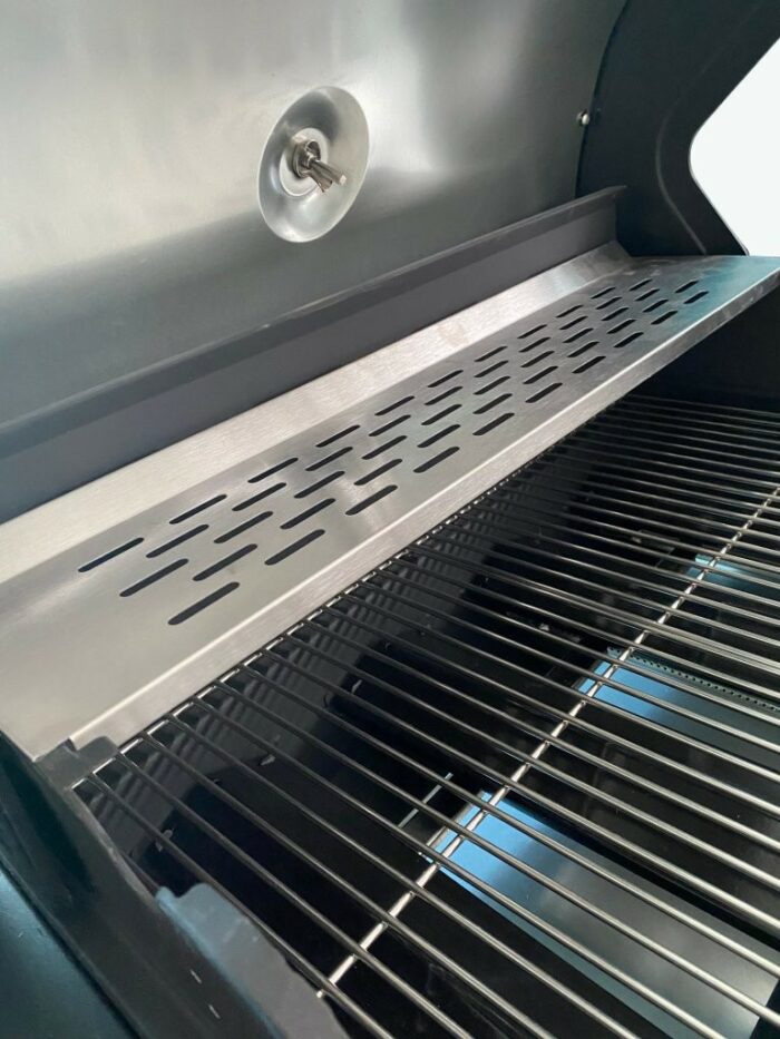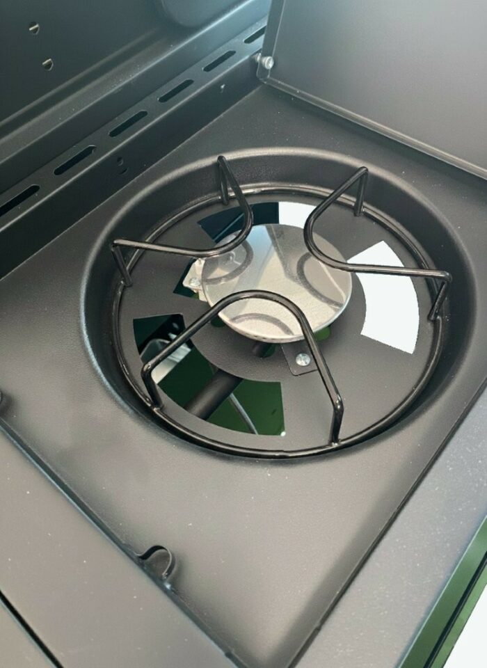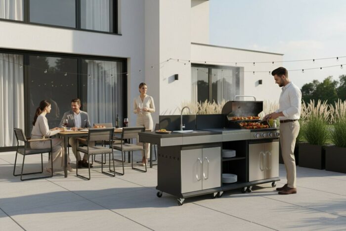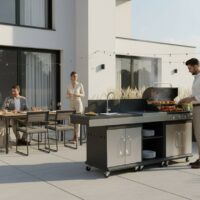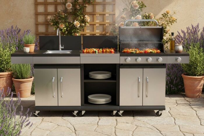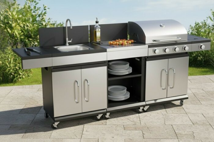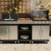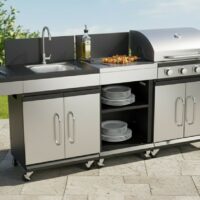 Cucina completa a Gas da esterno che combina diverse funzionalità in un’unica unità mobile: Barbecue a 4 fuochi con fornello laterale, vano porta bombola e porta oggetti con ante in acciaio inox, lavello con rubinetto e vano porta stoviglie con ante in acciaio inox; piano di lavoro e mensole a giorno.