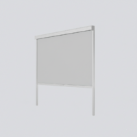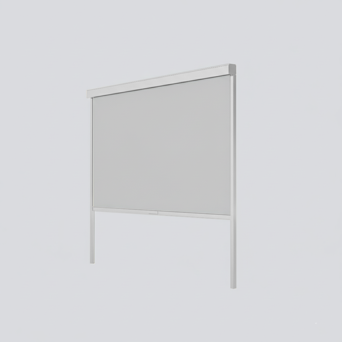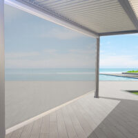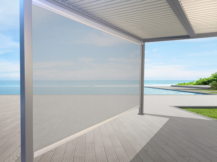 Pannello di chiusura laterale avvolgibile con guide verticali. Apertura e chiusura con sistema drop down, con struttura e guide in alluminio verniciato a polvere e pannello in textilene.