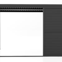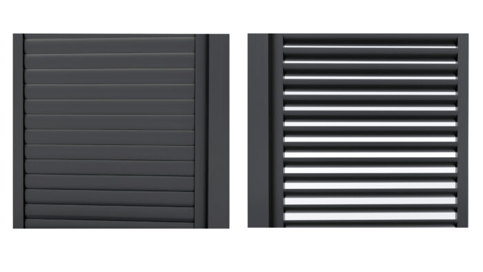 Parete Laterale a pannelli scorrevoli in alluminio verniciato a polvere tipo persiana con lamelle orientabili manualmente per regolare il flusso di aria o la quantità di luce.