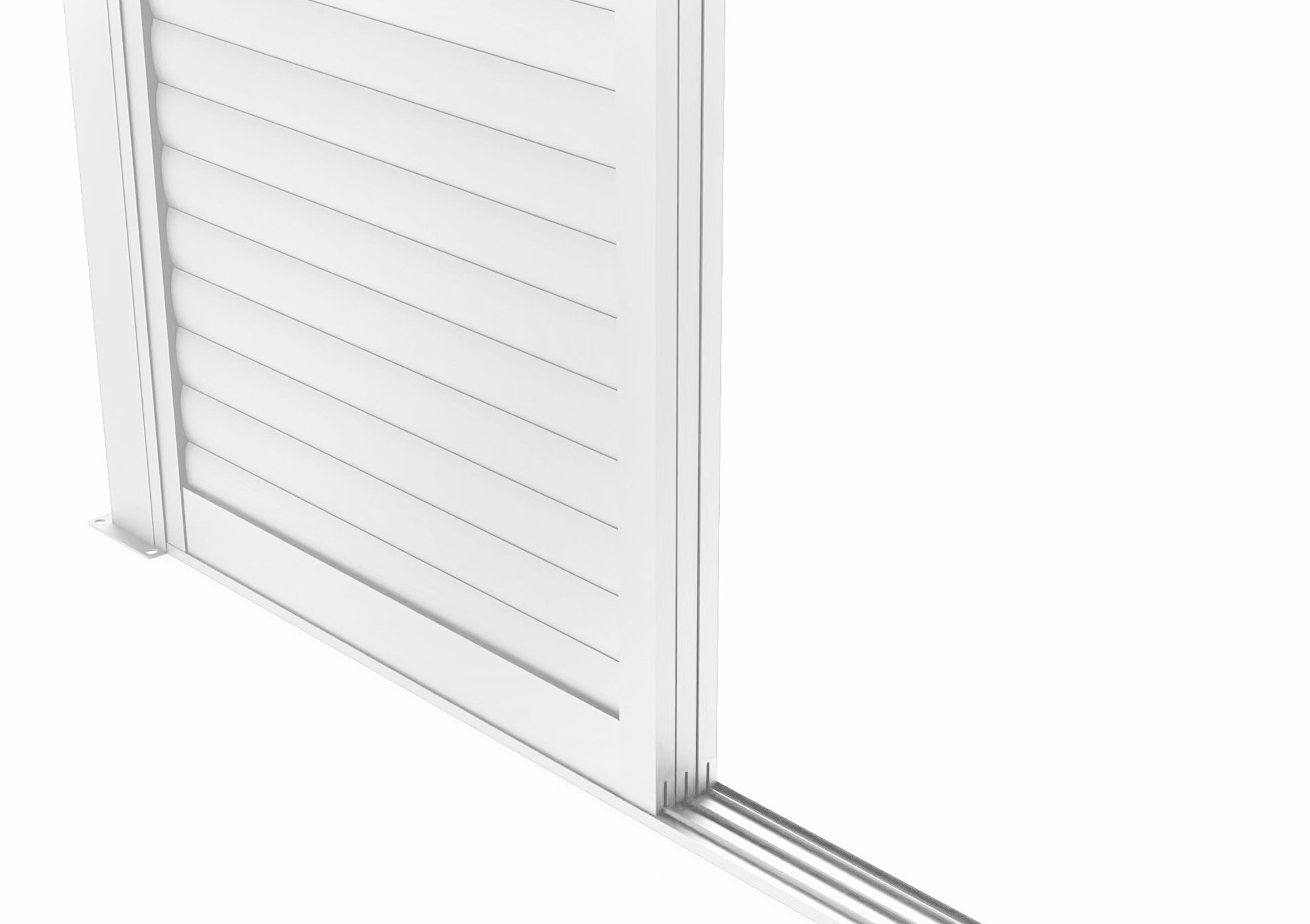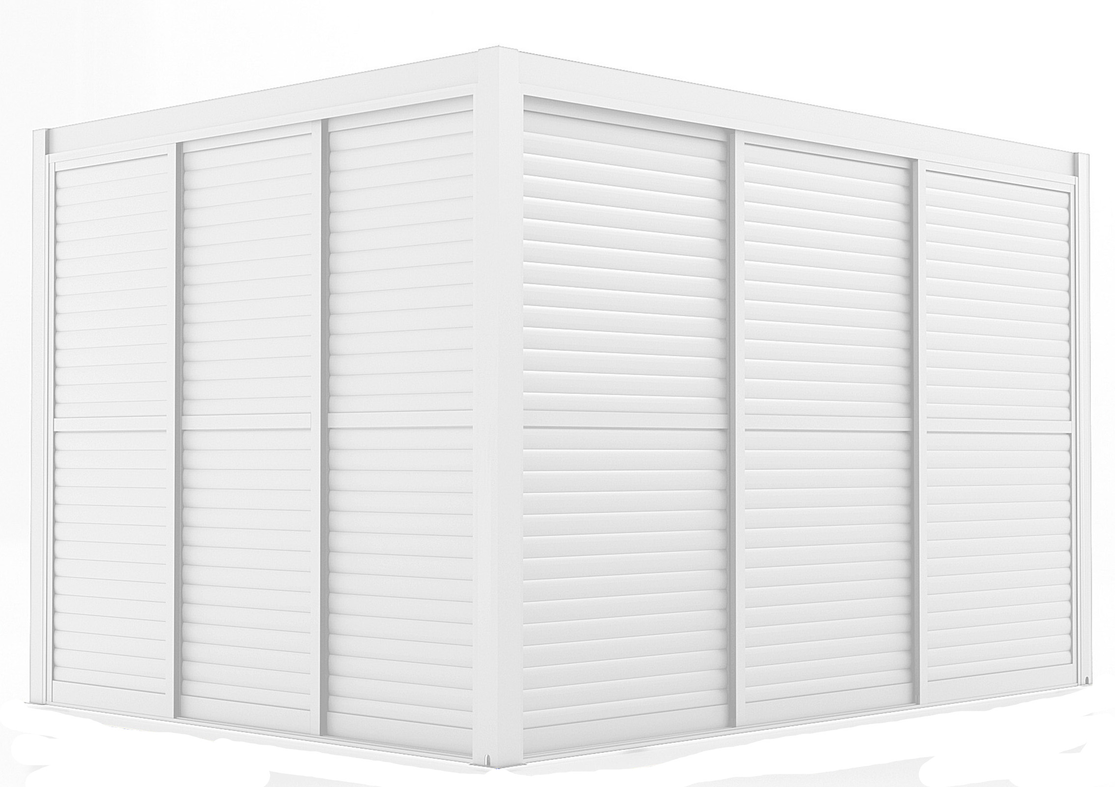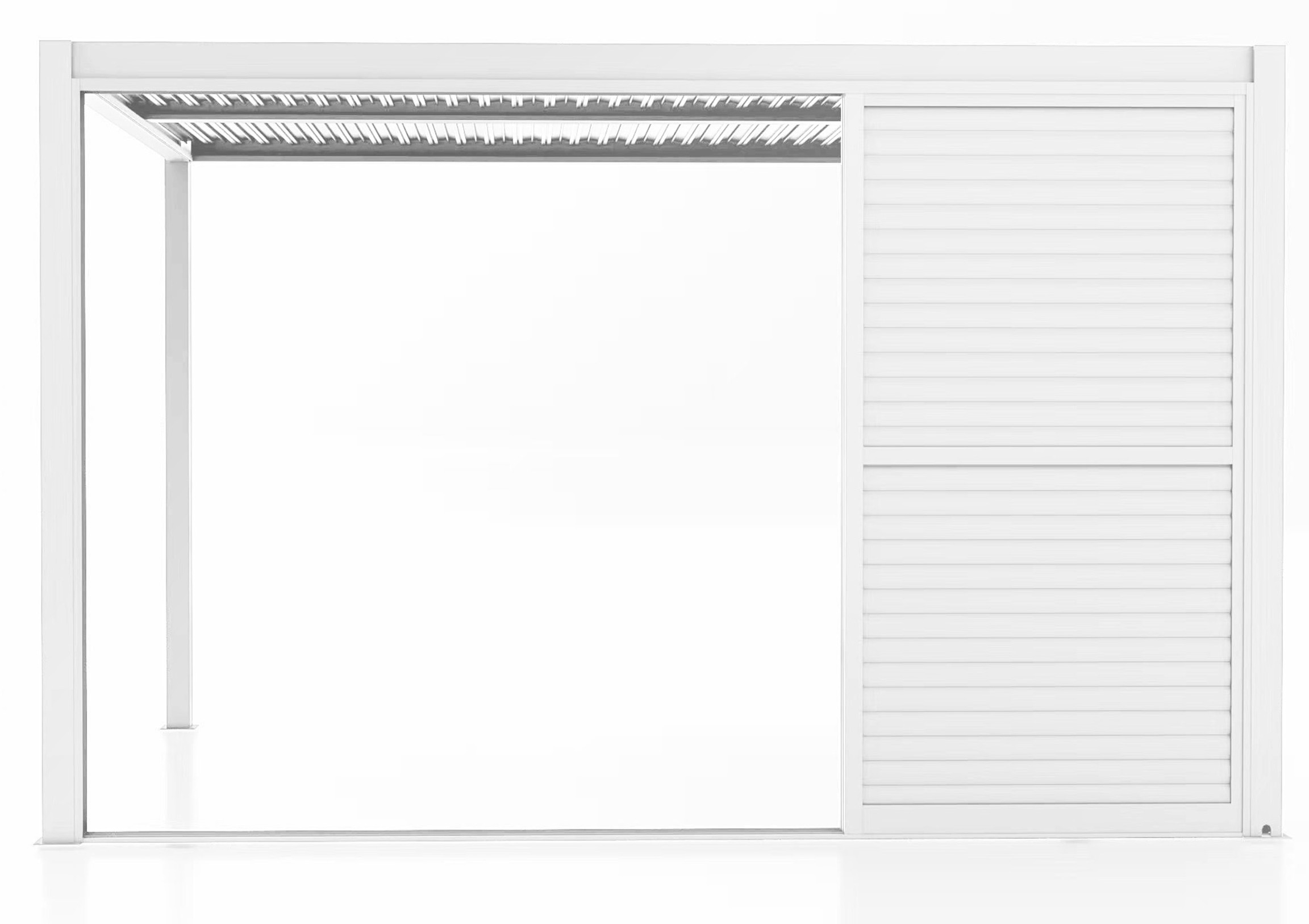 Parete Laterale a pannelli scorrevoli in alluminio verniciato a polvere tipo persiana con lamelle orientabili manualmente per regolare il flusso di aria o la quantità di luce.