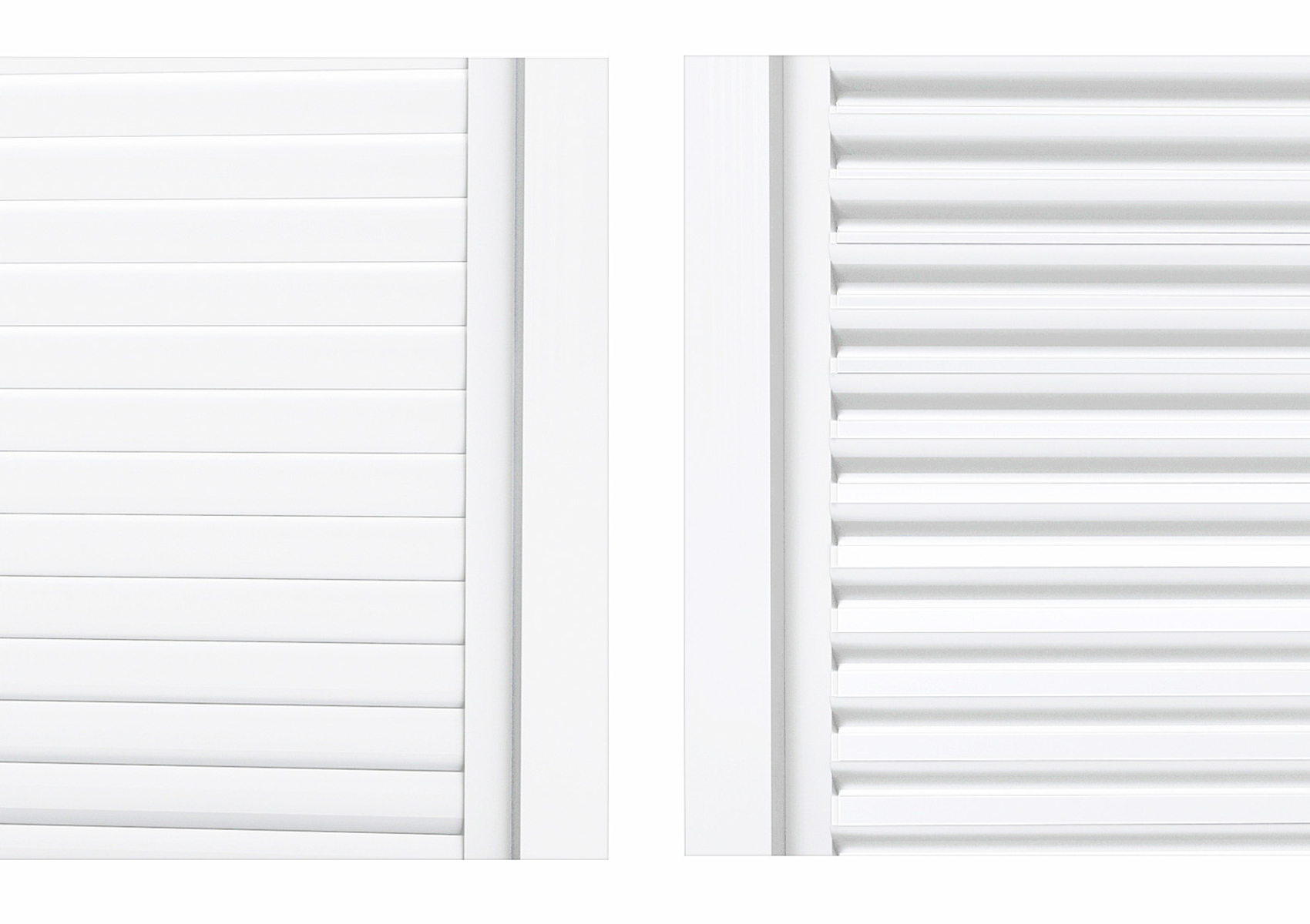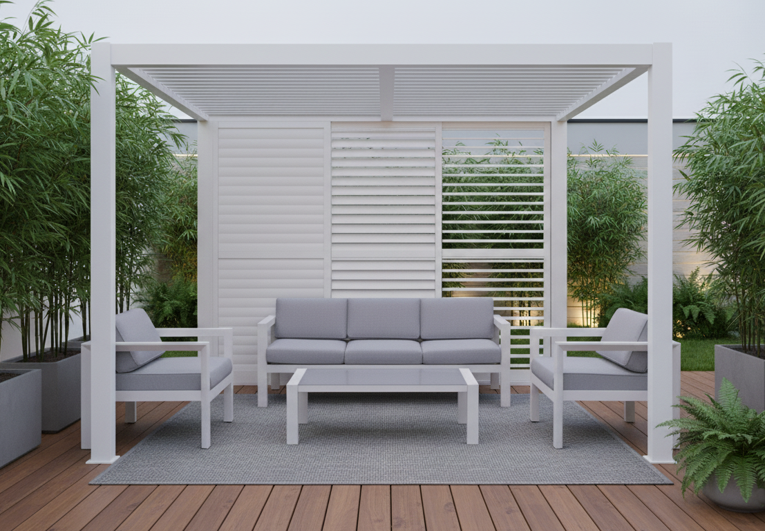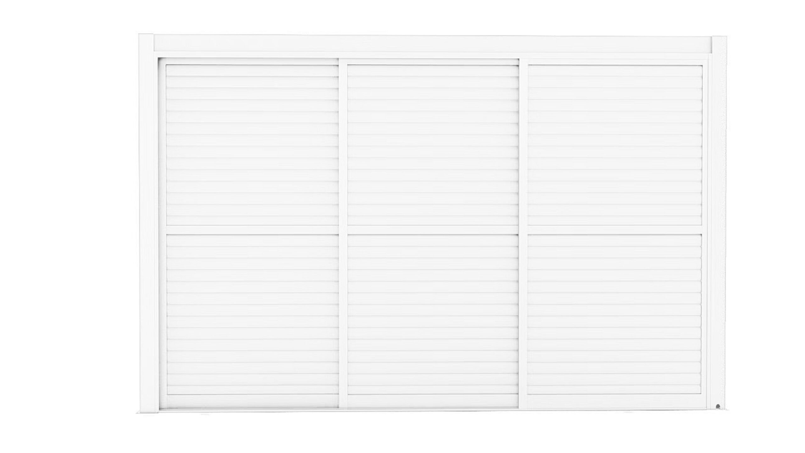 Parete Laterale a pannelli scorrevoli in alluminio verniciato a polvere tipo persiana con lamelle orientabili manualmente per regolare il flusso di aria o la quantità di luce.