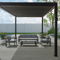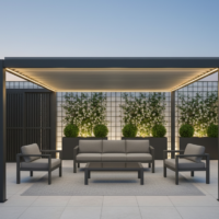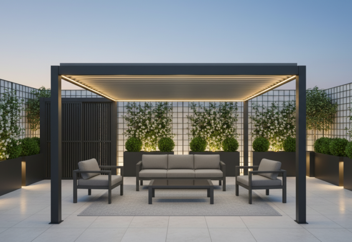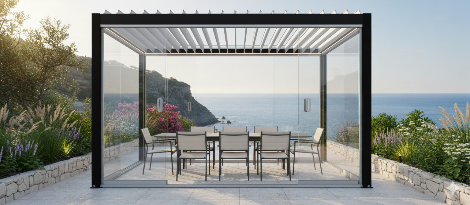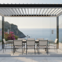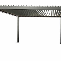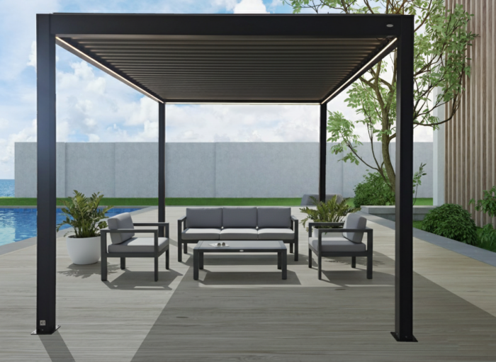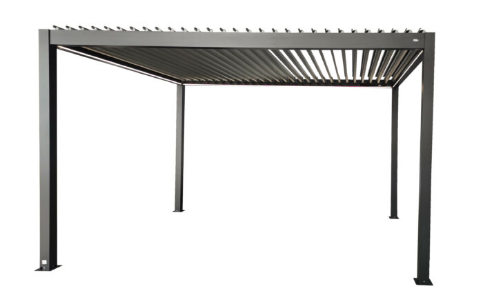 Pergola bioclimatica motorizzata con struttura in alluminio verniciato a polvere, viteria in acciaio inossidabile e lamelle doppio strato.
