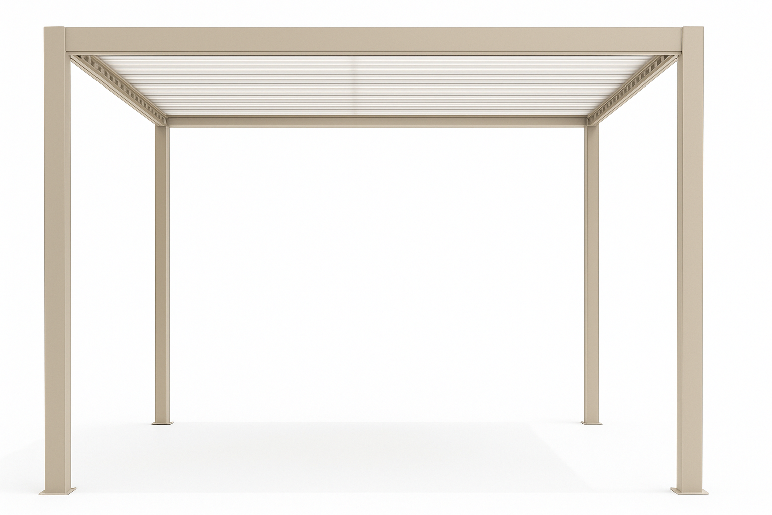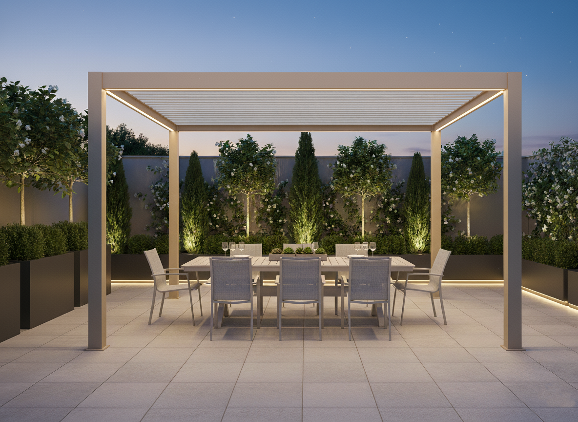 Pergola bioclimatica motorizzata con struttura in alluminio verniciato a polvere, viteria in acciaio inossidabile e lamelle doppio strato.