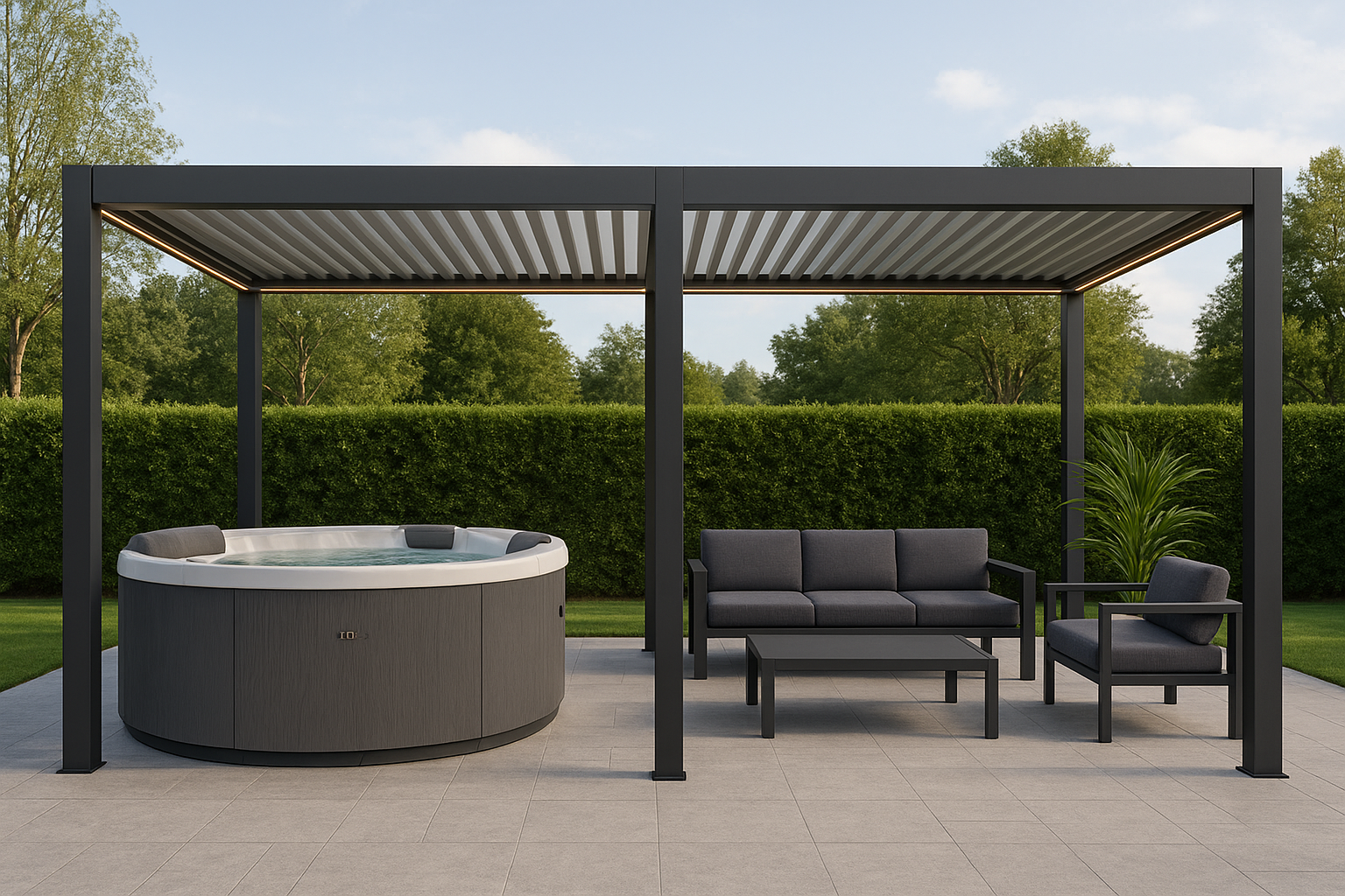 Pergola bioclimatica motorizzata con struttura in alluminio verniciato a polvere, viteria in acciaio inossidabile e lamelle doppio strato.