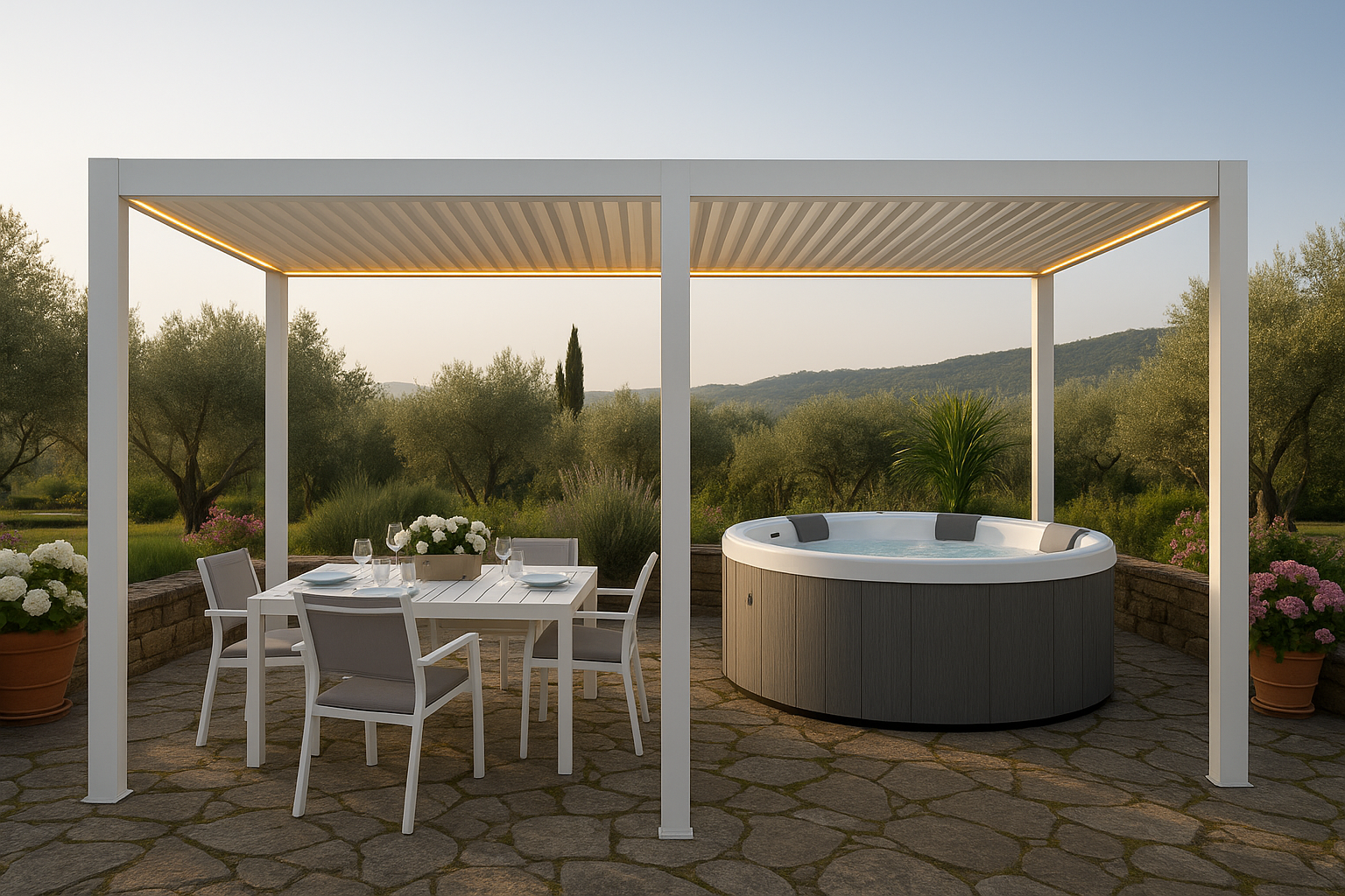 Pergola bioclimatica motorizzata con struttura in alluminio verniciato a polvere, viteria in acciaio inossidabile e lamelle doppio strato
