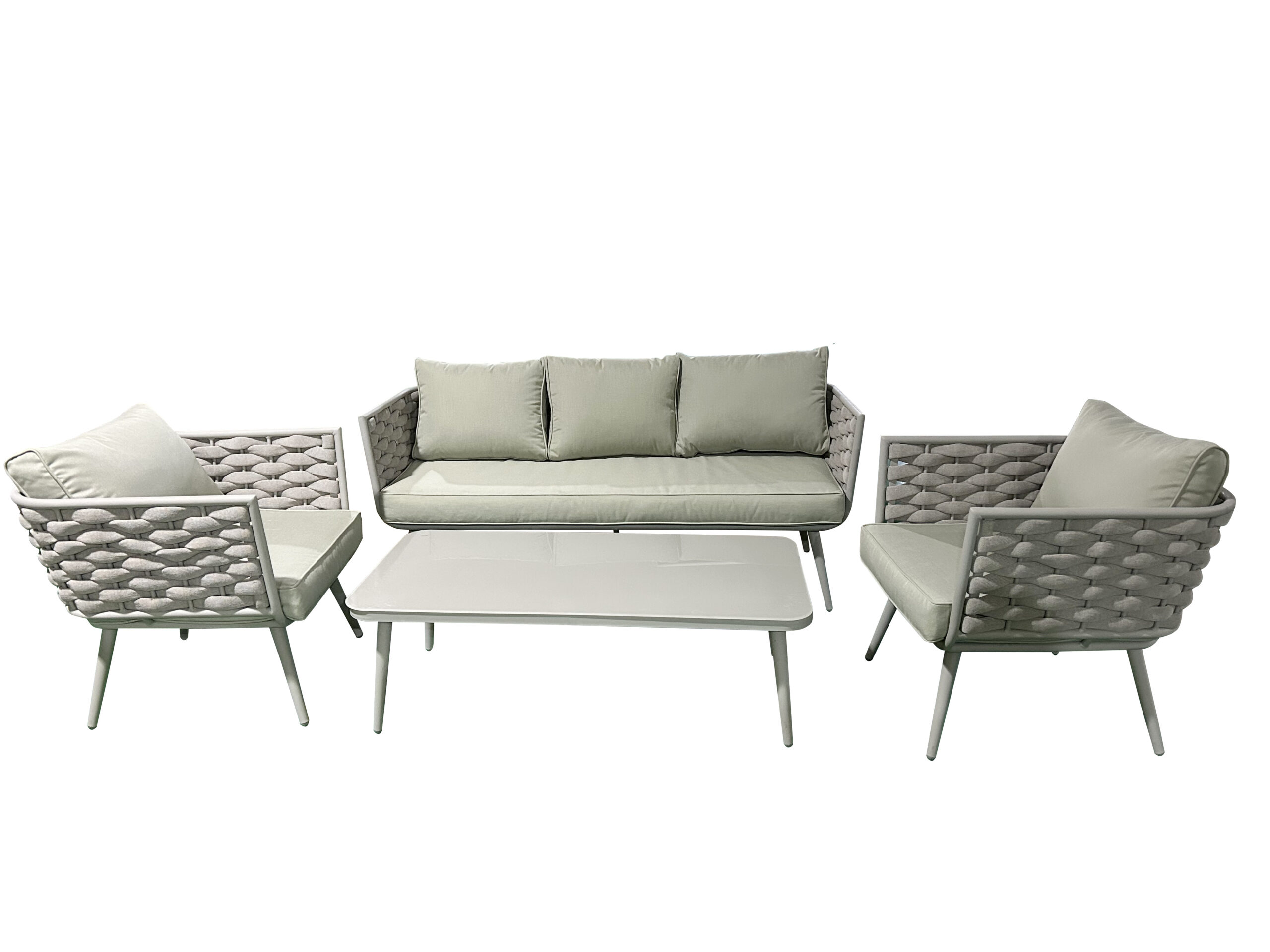Bucaneve è un salotto in alluminio e poliestere composto da un divano a due sedute, due poltrone ed un tavolino con top in vetro temperato.