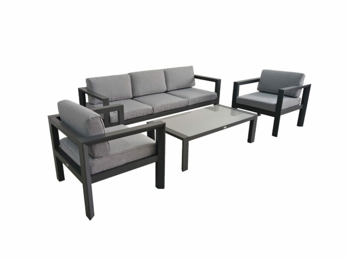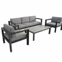 Hibiscus è un set in alluminio composto da un comodo divano tre posti, due poltrone ed un tavolino, con cuscini sfoderabili in poliestere alta densità.