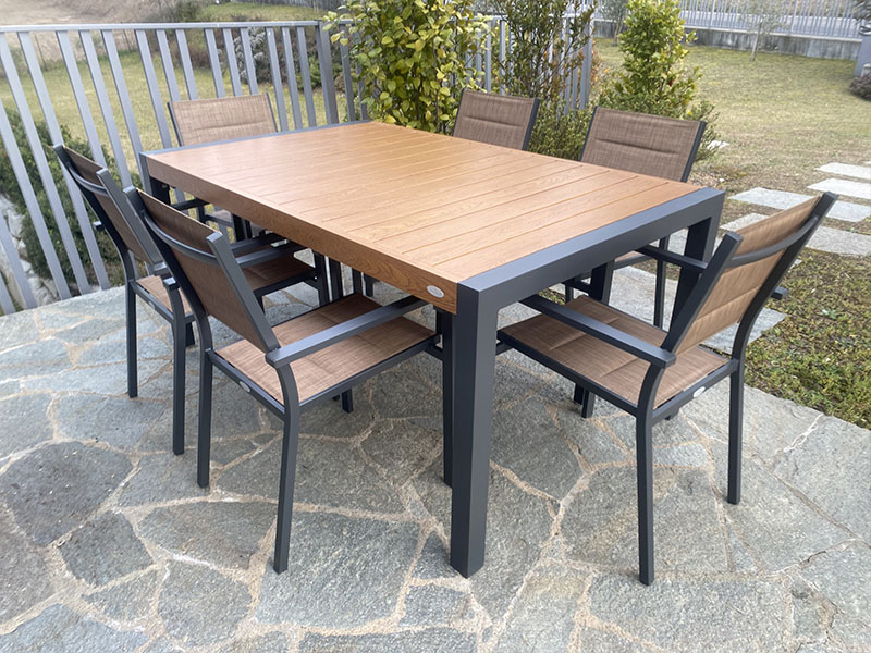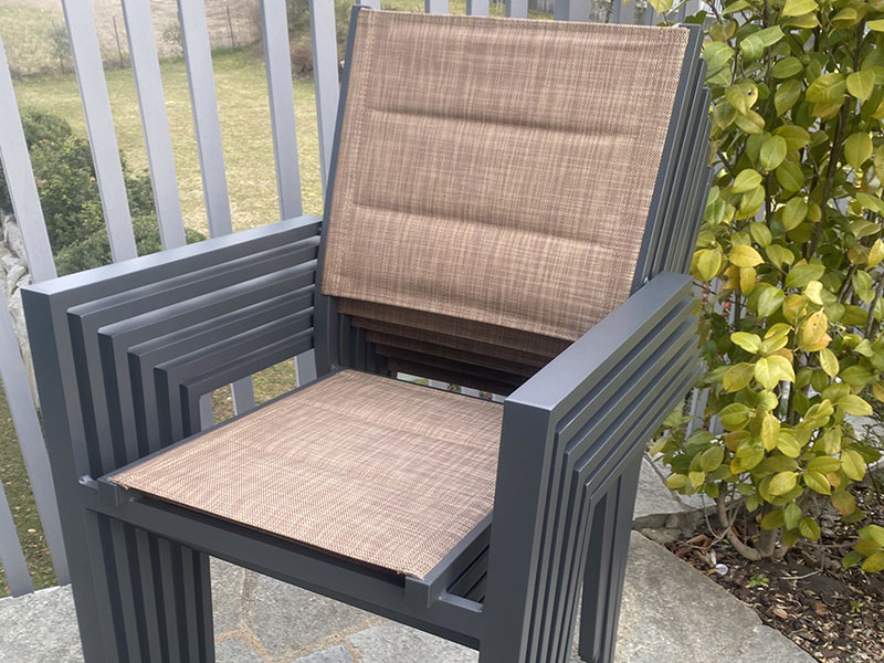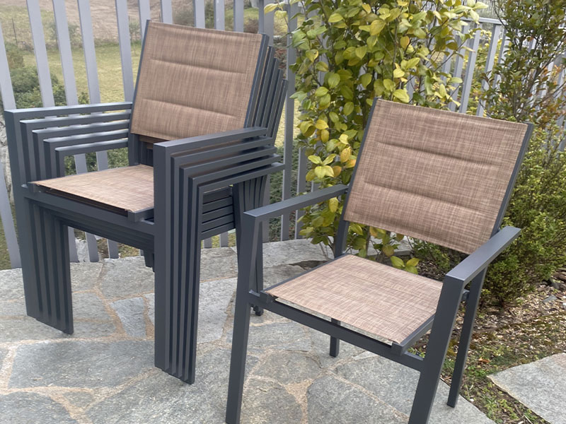 La confezione include 6 sedie con struttura in alluminio color antracite e textilene doppio strato di colore marrone a due toni con imbottitura interna sulla seduta e sullo schienale (dimensioni sedia 55*56*85cm sezione tubi: 38×18/28*14mm).