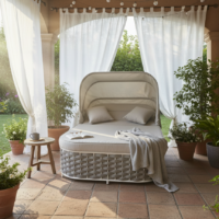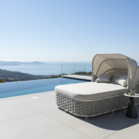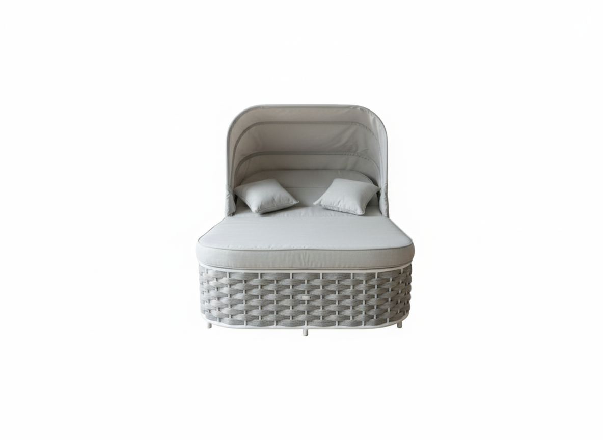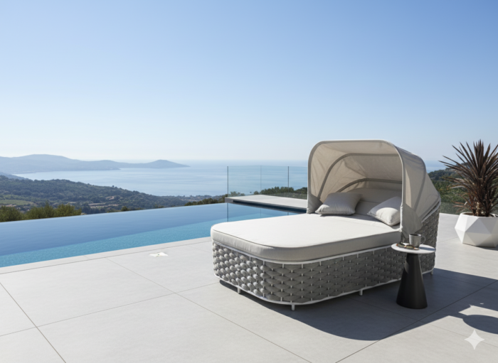 Agapanthus è un sunlounge doppio rivestito di un intreccio in maglia tubolare di textilene che ne caratterizza il design moderno e accattivante.