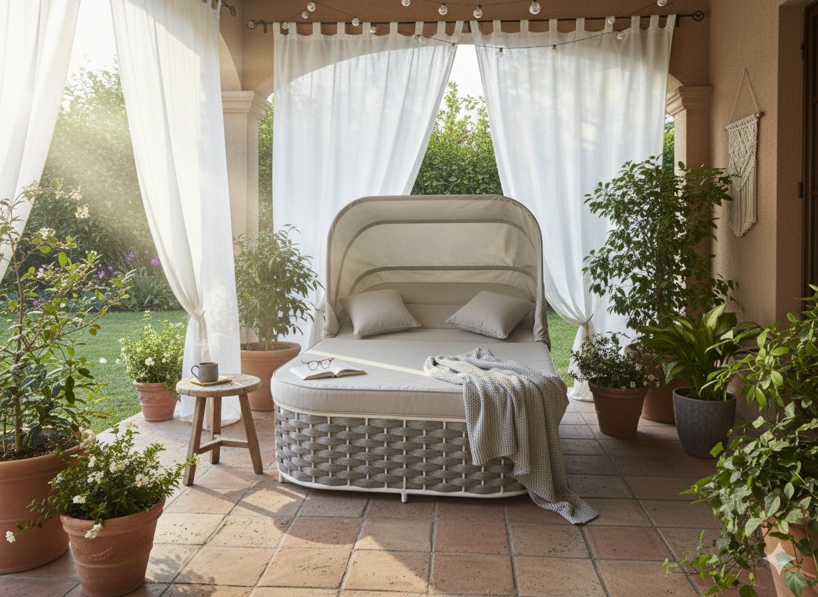- Cuscini, intreccio e cappottina: grigio chiaro