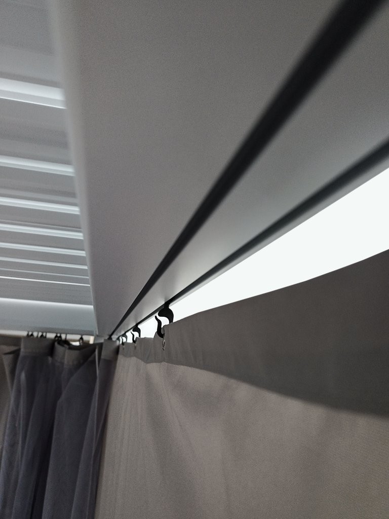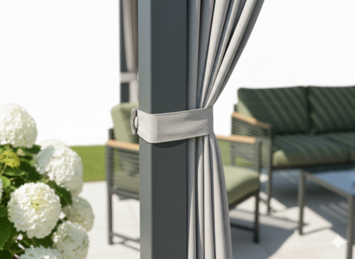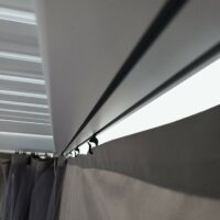 Set completo di tende composto da 4 pannelli in poliestere con zip di chiusura ed embrasse con velcro per fissaggio ai pali e per raccogliere la tenda aperta. Il set è completo dei ganci per il fissaggio alle guide dei traversi di Solanum Plus e Solanum Twin.