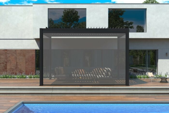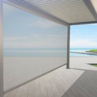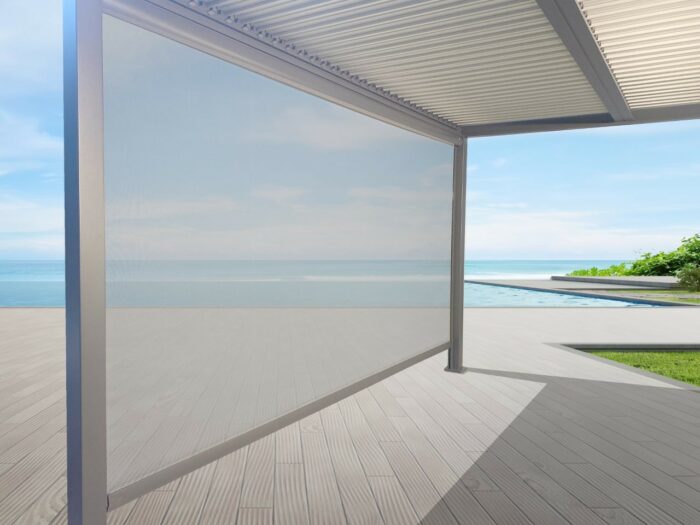 Pannello di chiusura laterale avvolgibile con guide verticali. Apertura e chiusura con sistema drop down. Disponibile in diverse versioni con struttura e guide in alluminio verniciato a polvere e pannello in textilene.