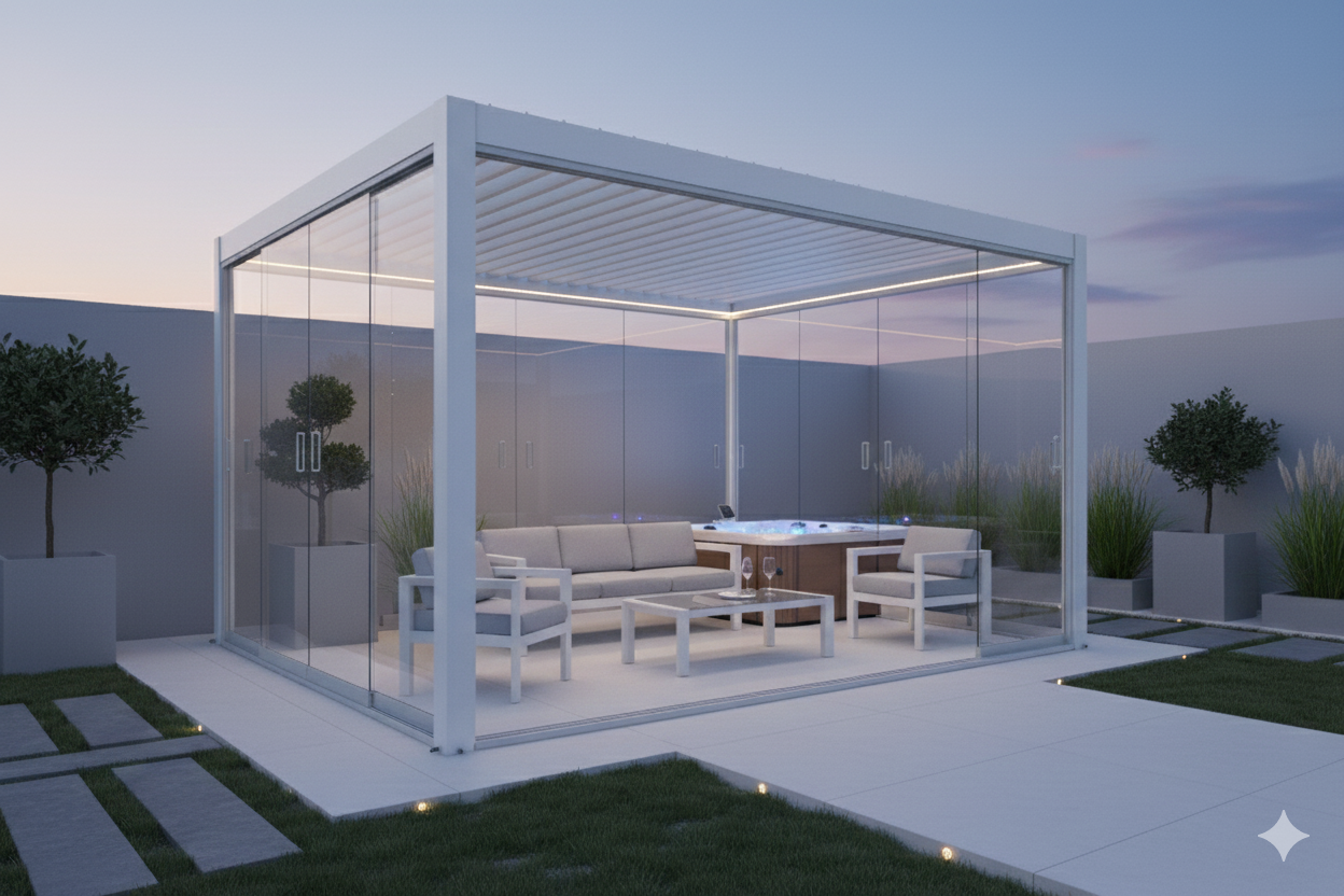 Parete Laterale a pannelli scorrevoli in vetro temperato 10 mm, con guide in alluminio verniciato a polvere.